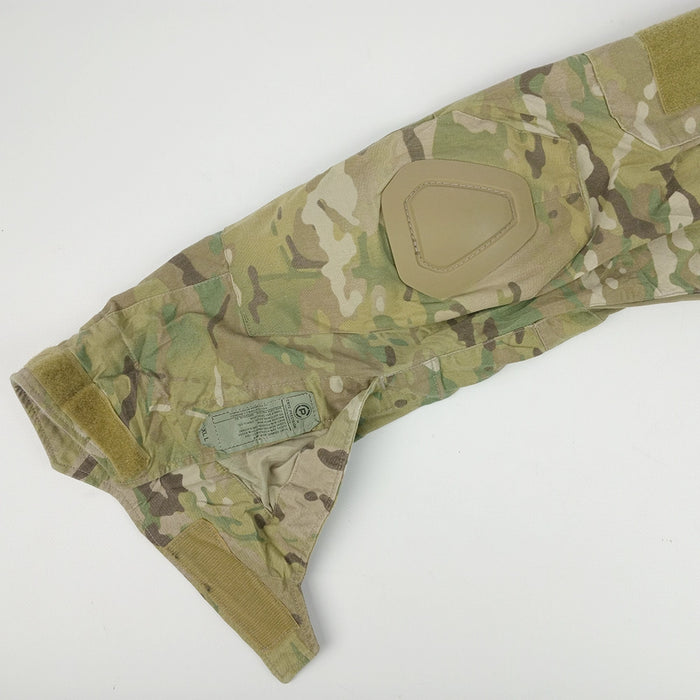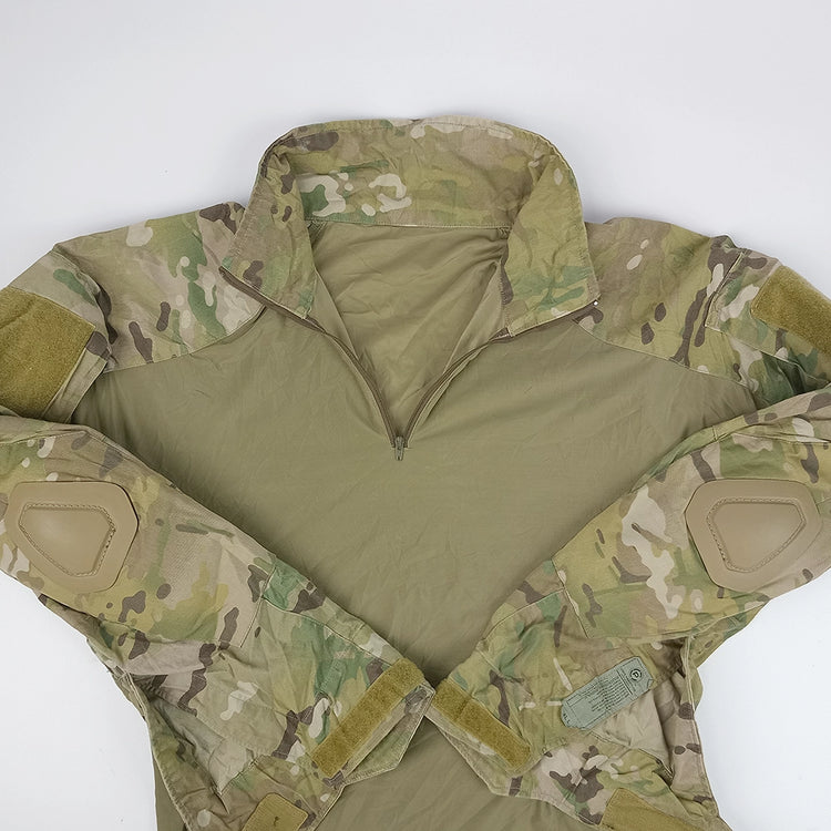 Generation 1 Crye Precision combat shirt. Differing from future generations, these have vertical arm pocket openings, silky soft wicking torso fabric and tag nested in the sleeve cuff adjustments (excellent design for rolling sleeves too). Includes elbow pads. Quite uncommon and very nice condition.