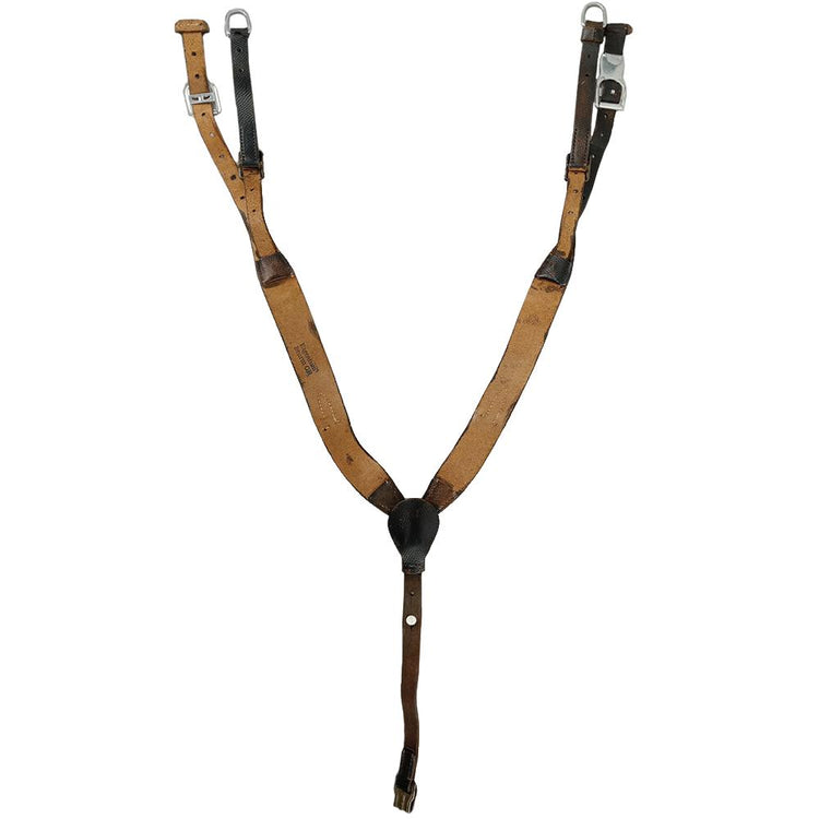 Original German WW2 Y-straps are hard to come by (and expensive!). Many other militaries roughly copied their design postwar and since then many of these have been used as 'German fakes' - that is exactly what these are. Original Czech Army suspenders, these have been shoe polished black and had the metal parts removed and replaced with D-rings and hooks a bit more similar to the original. Apart from the sharp reenactor/history buffs eyes, at a arms length these look right in place on a WW2 film set. That is where we believe a good number of these have been and made their way here!