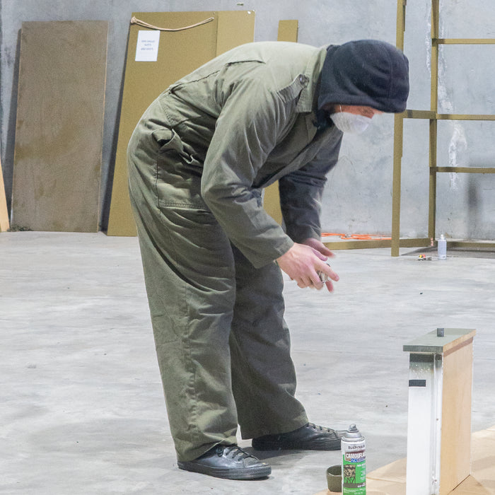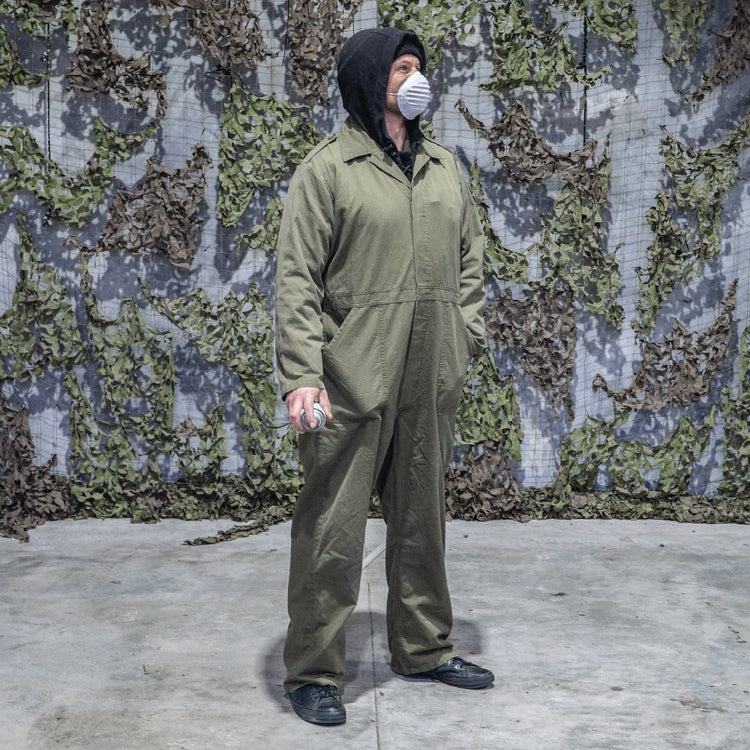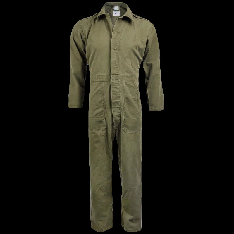 A genuine pair of mechanic's overalls from the Netherlands. Their army issue protective garments are plain and simple, a "just get the job done" kind of approach.