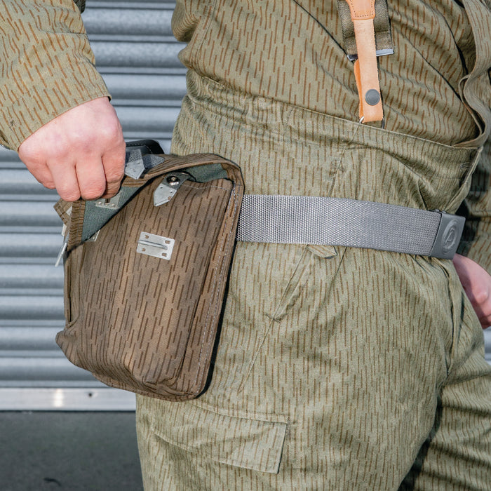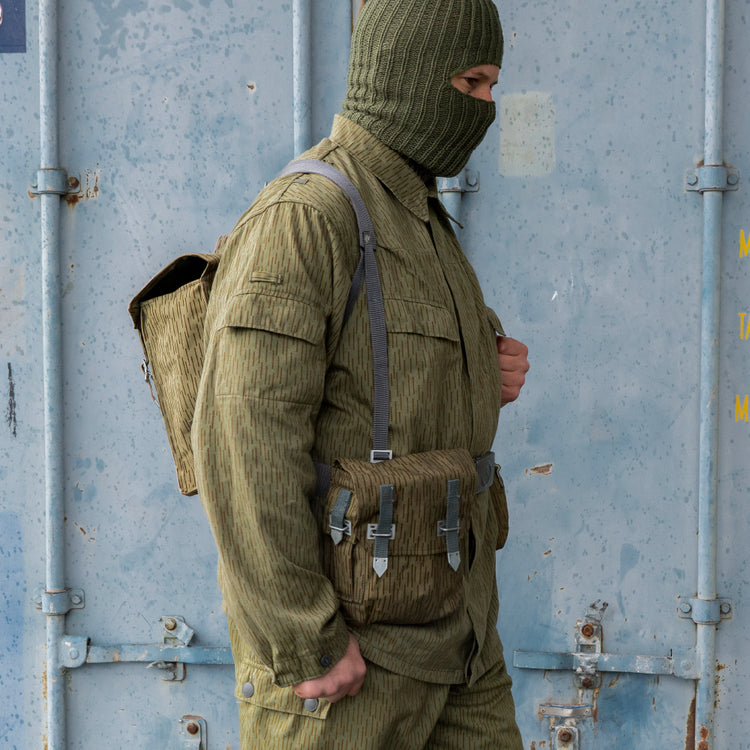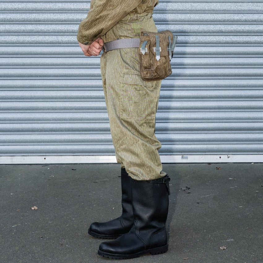 Common to all of these pouches is the rain camo pattern strichtarn, clasps to the front, belt loops to the back and they all have 4 cell divisions inside. The last iteration of East German uniform, UTV, included these pouches with green trim. Having fabric divisions and construction, the capacity can vary but these should happily fit 4x AK mags. Most of these pouches are in really nice condition but some show grime or a little storage corrosion.