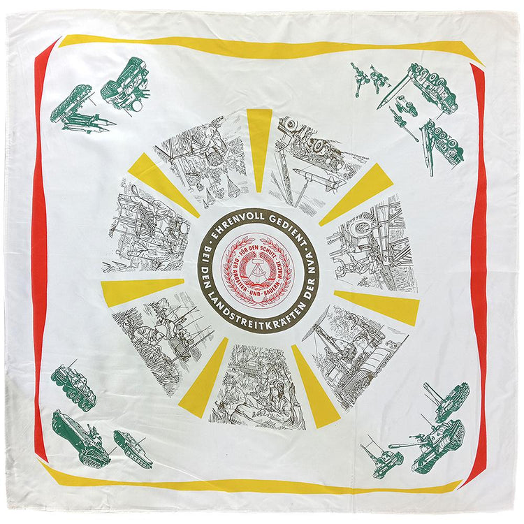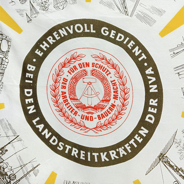 Germany has had a whiplashed history over the last century. One of the various episodes was the Cold War and the division of Germany. As we all know now, Socialist East Germany dissolved with the fall of the Berlin wall in 1989. Information/translations for these scarves vary widely, but we believe these were made for NVA soldiers as a souvenir for their service. What we managed to roughly translate on the scarf is this - 'Honorably served in the infantry of the NVA' and 'For the protection of the workers and farmers power' in the inner DDR circle. The packaging itself is interesting as well with a NVA soldier leaping over a wall towards family - into which Germany, who would know!