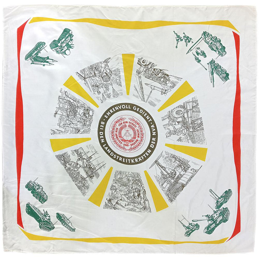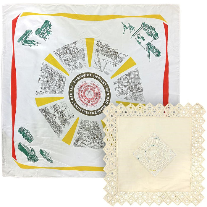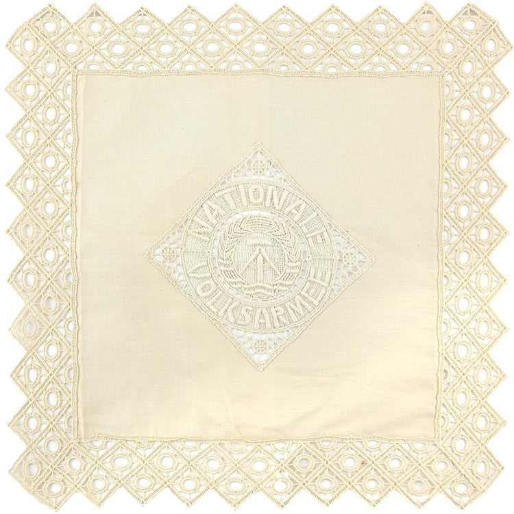 The scarf has a series of images showing different portions of the military from tanks to CRBN crews along with the DDR coat of arms front and centre. The doily included has decorative embroidery surrounding the outside along with the coat of arms and 'Nationale Volksarmee' in the middle. For some it seems like just yesterday still, but we are already decades on and these will only become more collectible over time as a Cold War era relic.