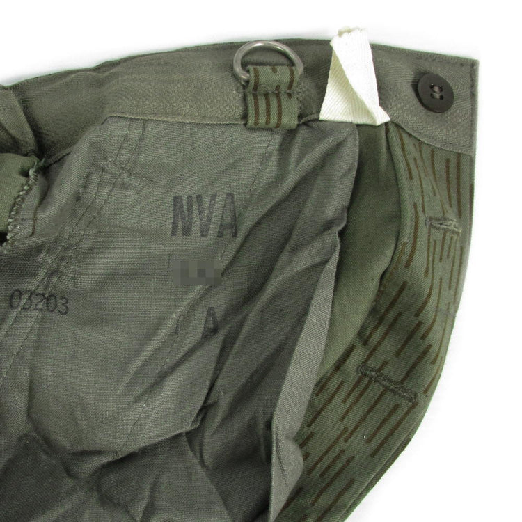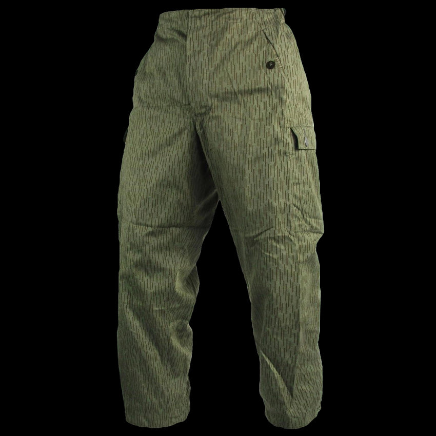 These unused East German combat trousers were issued to the Nationale Volksarmee (NVA) from 1968 to 1990. Featuring the distinctive Rain Camo pattern (Strichmuster), inspired by WWII German designs like Splittermuster and Sumpftarn. Due to the range in manufacture, have a mix of models. Some may have no knee reinforcement, square reinforcement or polygonal reinforcement, seat reinforcement and some may have shrouded cargo buttons and others not. These will be picked at random.