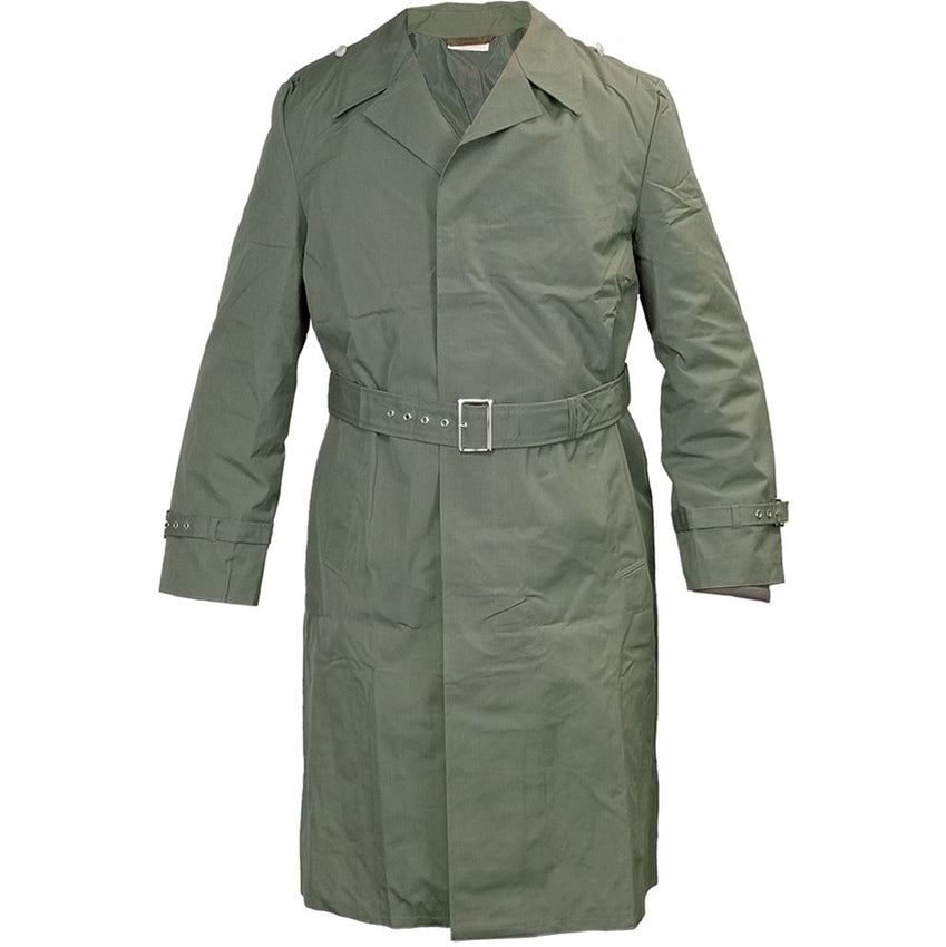 These have a water resistant outer and rubberised interior, additionally a layer around the upper inner torso assumed to act like a moisture vapour permeable layer. These come with belts (stashed in the pockets), adjustable belted cuffs and buttons on the underside of the collar to attach hoods which are unfortunately not included (though a few have a surprise hood stashed in a pocket too). Rank insignia can be attached via small loops and buttons to each shoulder. There is a little variation in hue to these coats but all are a degree of olive drab and in excellent quality, appearing to be unissued. The rubberised interior is in good condition but may be susceptible to abrasion wear, due to their age. The trench itself is very lightweight and packs down to a small size. Keep one handy to keep the rain off your rain camo, complete a kit or just generally stay dry in normal everyday situations.