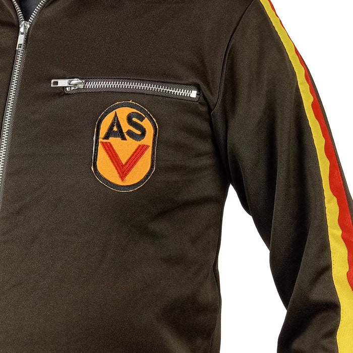 The striking red & yellow stripes and the ASV logo are likely to turn some heads in your gym! The dark chocolate brown paired with the large stretchy collar also scream a 1970's vibe (hope you have a meaty slug mo to match). A full length zip runs up the front and a stretchy waist & cuffs makes these pretty cozy.