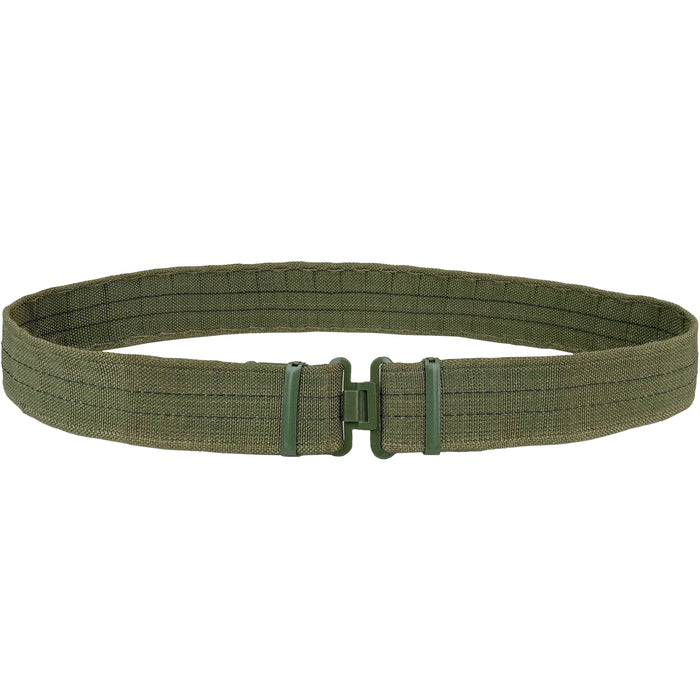This hardy belt is olive drab, woven nylon with metal fixtures. No fancy business. Not even any different sizes, just one length (fits up to 42'', about medium size) + buckle and ability to adjust smaller. The buckle is a no fuss hook-through type and the belt has metal capped ends with claws to hold your adjustment. Some storage blemishes but otherwise pretty much unused! A good belt to add to a collection and get you through ''the 4 deadly enemies of socialism. Spring, summer, autumn, winter.''