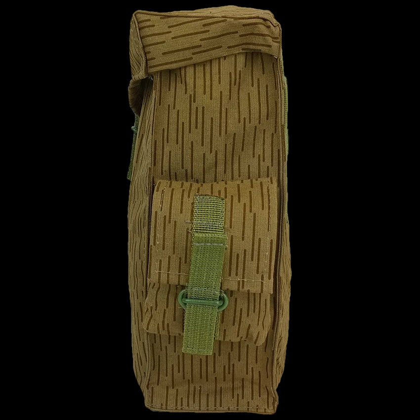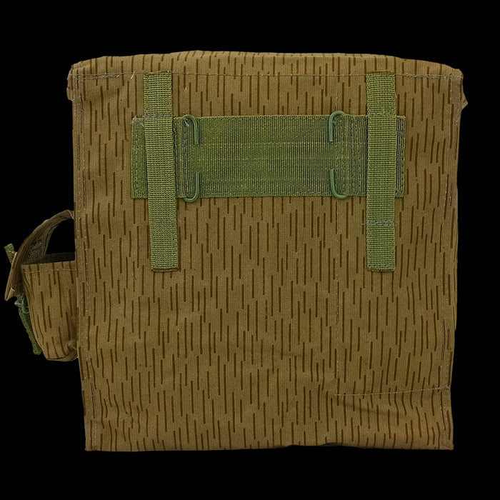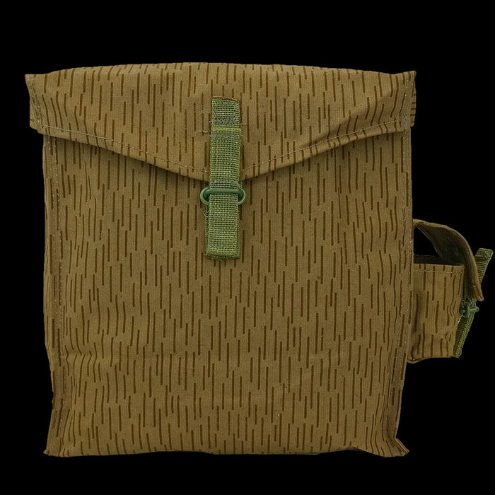 Made from canvas with a rubberised backing, these have a small pocket on the outside and 3 internal partitions made with fabric, for storing your gas mask bits. These divisions are made from the same outer fabric, so they are non rigid - very flexible (and probably easily removed if you feel like it). The bag has belt loops and wire to attach to your UTV webbing belt. Like the older strichtarn bags (with the grey webbing system), these would make great side pouches on bikes or shoulder bags with a bit of DIY for straps! Some may scoff at modifying these items, as these are fairly collectable, from an extinct country.