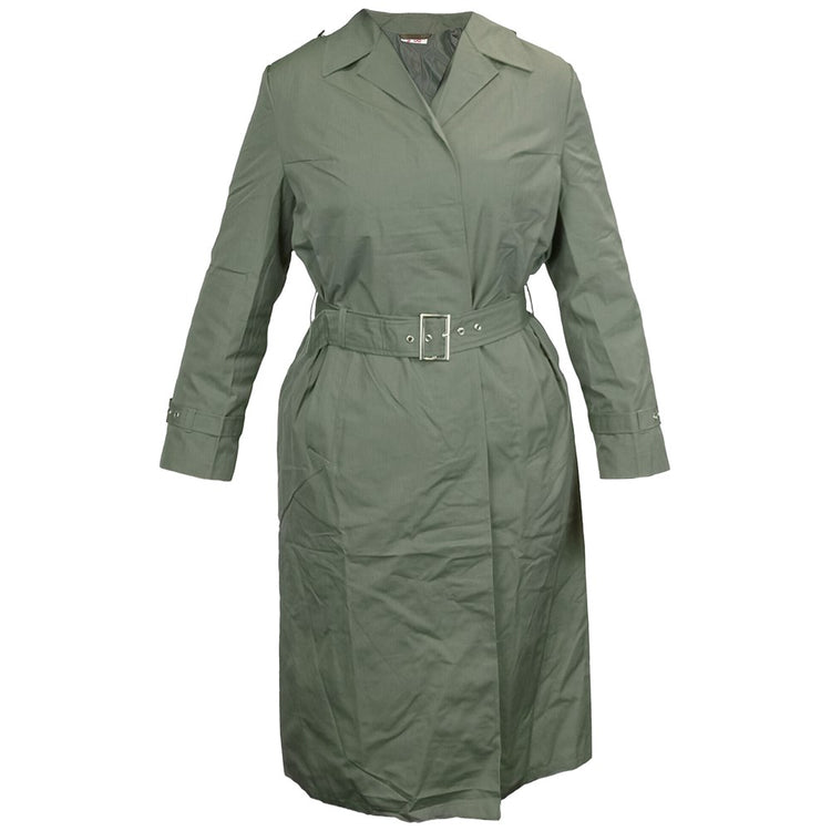 The women's cut of this jacket varies only slightly to the men's, where the front fastening direction is opposite and small darts in the bust area. They're not the shapeliest trench but the fit is adjustable with the waist belt. These have a water resistant outer and rubberised interior, additionally a layer around the upper inner torso assumed to act like a moisture vapour permeable layer. These come with belts (stashed in the pockets), adjustable belted cuffs and buttons on the underside of the collar to attach hoods which are unfortunately not included (though a few have a surprise hood stashed in a pocket too). Rank insignia can be attached via small loops and buttons to each shoulder. There is a little variation in hue to these coats but all are a degree of olive drab and in excellent quality, appearing to be unissued. The rubberised interior is in good condition but may be susceptible to abrasion wear, due to their age. The trench itself is very lightweight and packs down to a small size. Keep one handy to keep the rain off your rain camo, complete a kit or just generally stay dry in normal everyday situations.