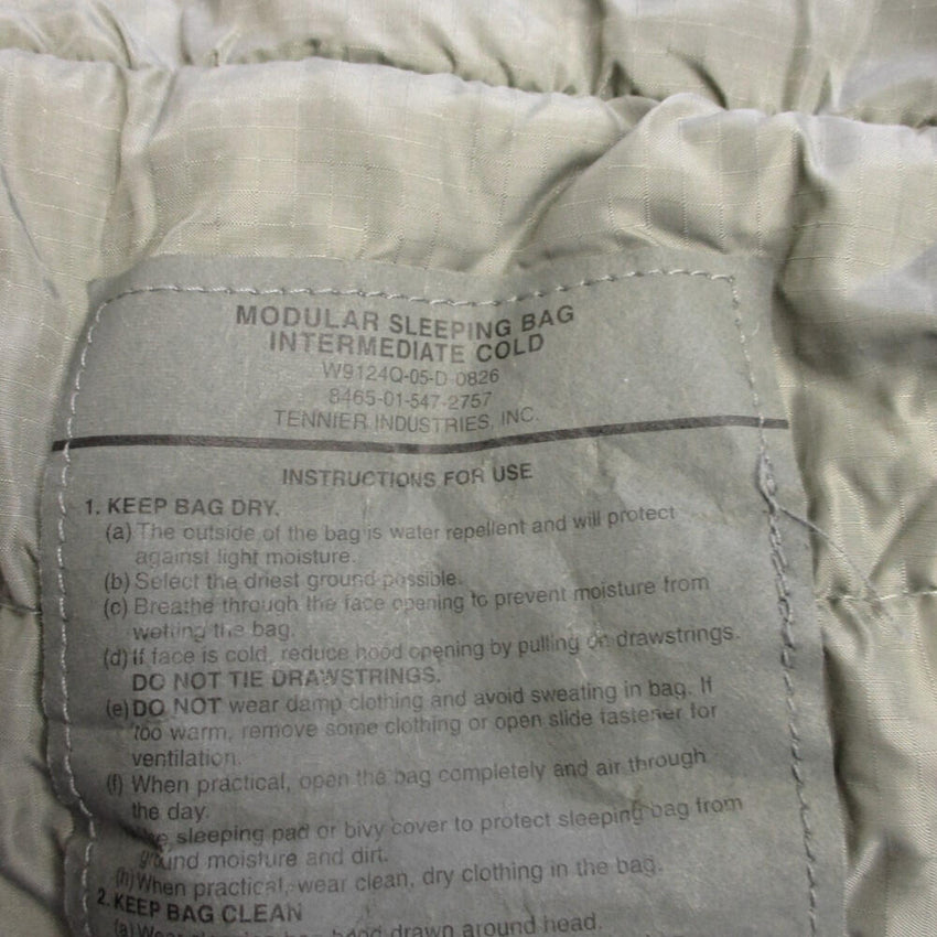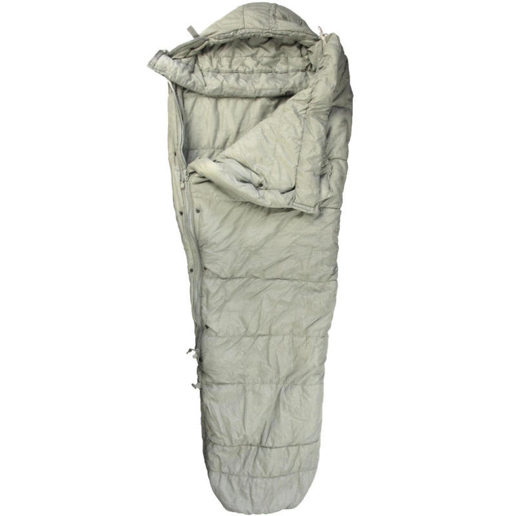 The ECWS (Extreme Cold Weather System) is a modular sleep system from the U.S. Military. These have imperfections such as small holes, fabric pilling, stains or broken zips. The system is made up of 3 items - the intermediate sleeping bag, patrol bag, and bivy bag. When all 3 bags are used together they are rated for use at -40 degrees Celsius. This is just the Intermediate sleeping bag which can be used on its own, rated at -23 degrees Celsius. It is worth noting that these ratings are based on what temperature you could survive in for a certain amount of time (4 hours), not what temperature would be comfortable.