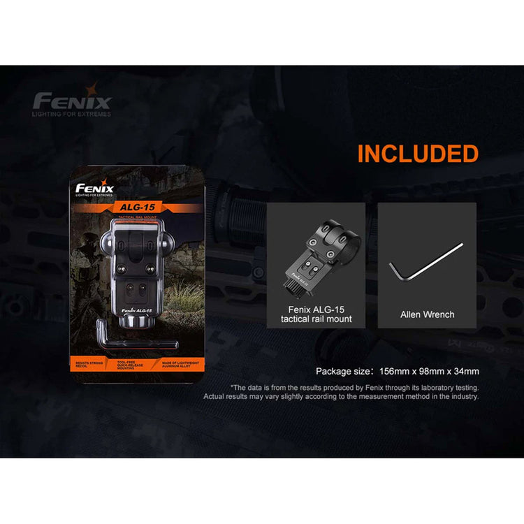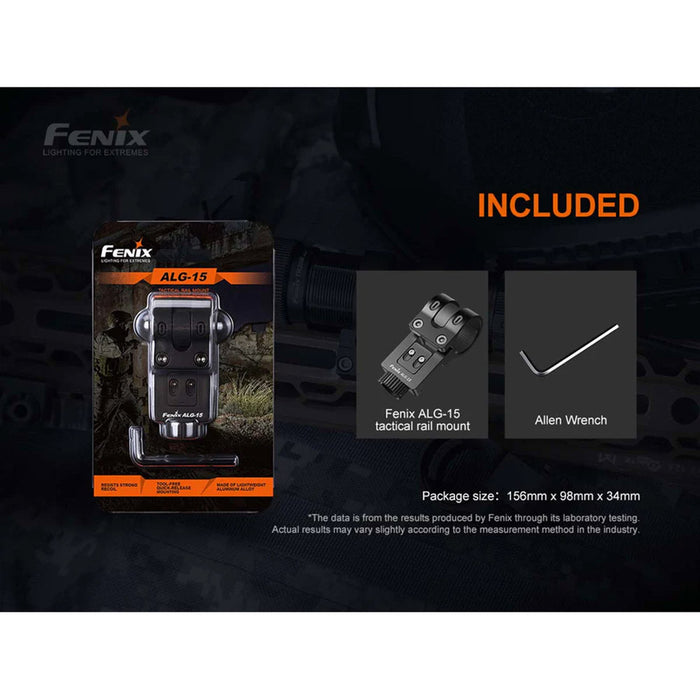 The Fenix ALG-15 Picatinny Rail Mount, is a great solution for mounting a flashlight to a rifle with a Picatinny rail. The quick release roller allows you to mount a flashlight for a secure fit. Made of hard-anodized aluminum, this mount is strong, lightweight and durable. The internal diameter is suitable for torch bodies 23.5-25.4mm (up to 26mm with removal of internal rubber pad) with torch heads less than 40mm.