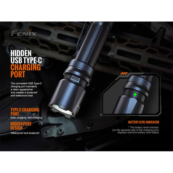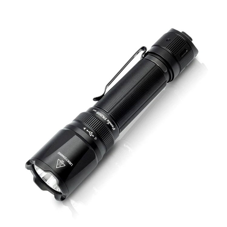 The Fenix TK20R V2.0 rechargeable flashlight features incredible performance by throwing a maximum 3000 lumens 475m (1558 feet). Quickly and easily operate the light, and choose between six lighting modes (5 levels of brightness + strobe), by using the dual tail switches. Recharge the TK20R V2.0 by unscrewing the protective charging port cover and plug in using a USB Type-C cable. The TK20R V2.0 is durable and rugged with an IP68 dustproof and waterproof rating. Powered by an included rechargeable 5000mAh li-ion battery, the Fenix TK20R V2.0 rechargeable flashlight is a great tool for outdoors or tactical applications.
