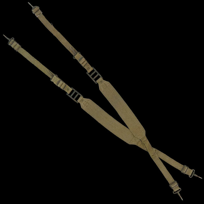 French crusty suspenders but a bit of history too. These were for the French TAP, the Troupes AéroPortées (airborne troops) and held up their webbing equipment. Similar in design to the US M1936 suspenders, these were often utilised by French Foreign Legion paras and during conflicts in Indochina, Algeria and the Suez Crisis. As seen in the images, there is a variety of canvas types and many of these are in a corroded and roughened state. We have two ''types'' to choose from, one having all 6 metal fastening clips and the other having 4 fastening clips.
