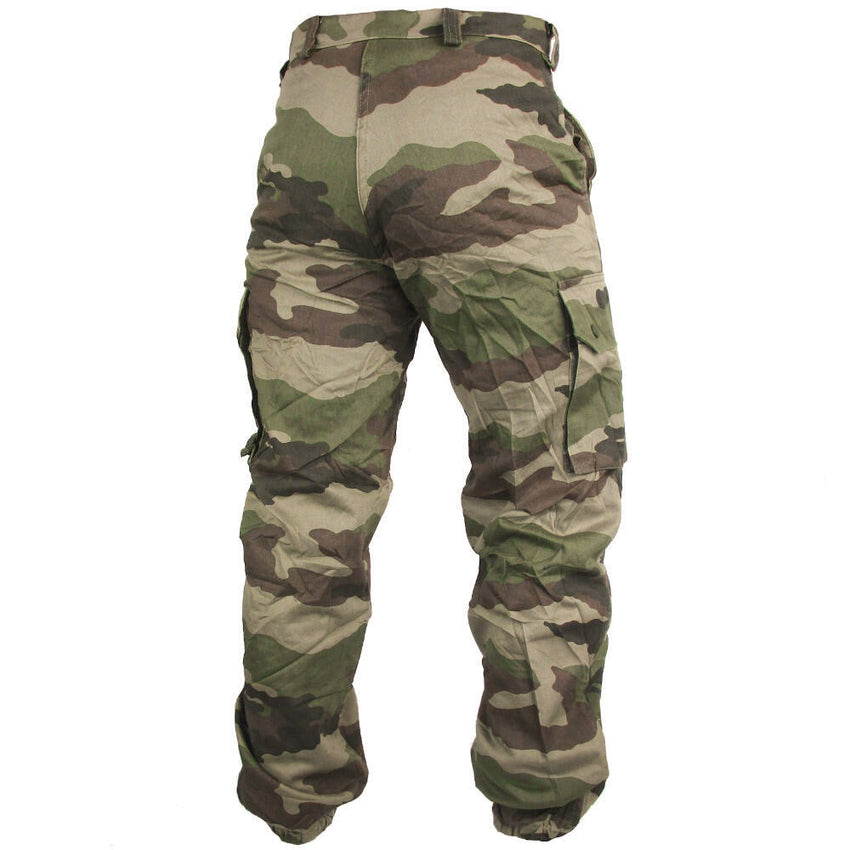 The French Army have issued a durable and practical trouser for their soldiers in case of a hasty retreat. These pants bear the popular CE (Central Europe) camouflage. The colours are similar to the U.S. M81 woodland camouflage but the large shapes in the pattern are distinctively French. The colours can vary with manufacture and age, as shown in the picture.