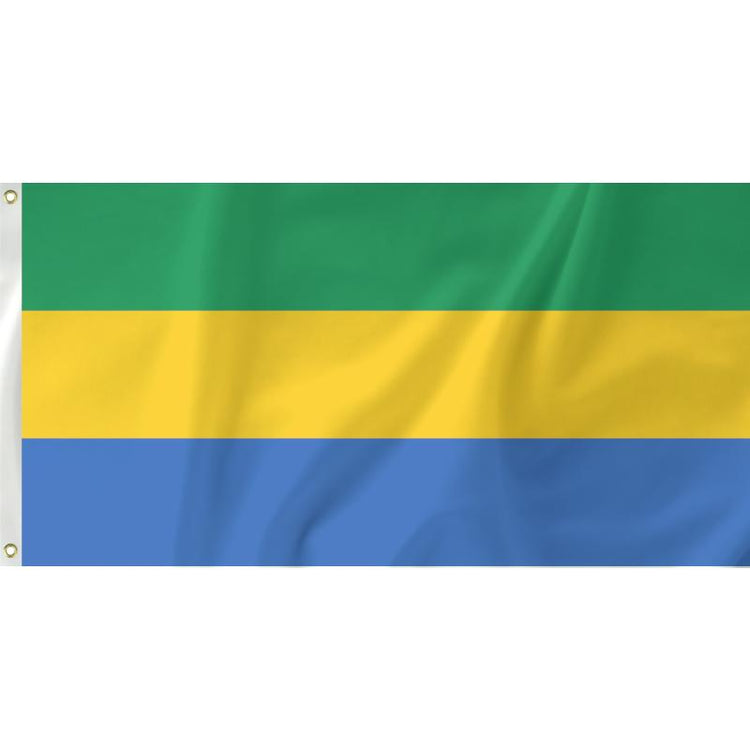 The flag of Gabon was adopted in 1960, the year they gained independence from France. Gabon chose a tricolour rotated in the opposite direction as France and used their own colours of green, yellow and blue. The green colour represents the natural resources of Gabon. Meanwhile the yellow colour alludes to the Equator the country sits on and also symbolizes the sun. And finally the blue represents the sea.