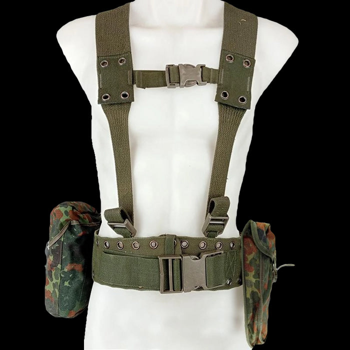 It's the flecktarn starter pack! Consisting of a German Flecktarn combat pack (butt pack), Flecktarn canteen cover and a Flecktarn entrenching tool pouch held together by a sturdy Bundeswehr webbing system. A great base web-set for hunters, paintballers or airsofters. Flecktarn assemble, GO!