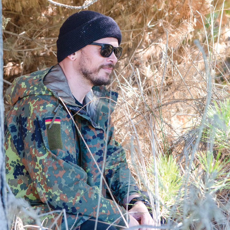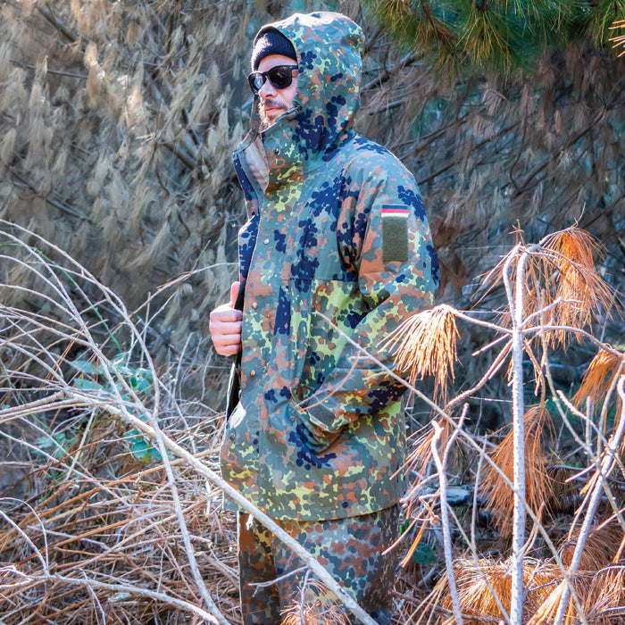 This German flecktarn jacket is a high quality, lightweight, and waterproof piece of clothing. The flecktarn pattern is a favourite among camouflage enthusiasts making this jacket an excellent outer layer for the colder times. These ''water vapour permeable 3-layer laminate'' garments have a breathable, waterproof and windproof quality, thanks to the clever construction. Being German, the permeable membrane is likely Sympatex (even better than Gore-Tex) though manufacture varies and these are dated around the 1990's.