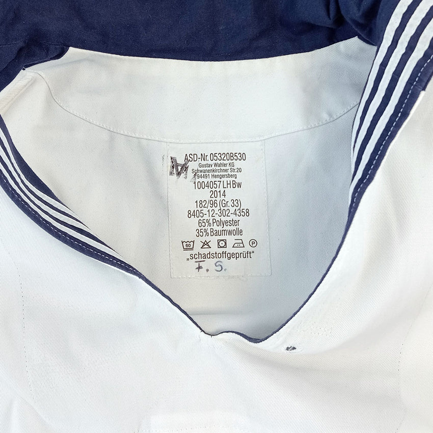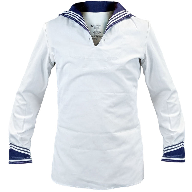 All aboard das SS-Wunderbar! These shirts are what the German navy equips its sailors with and my oh my, they are dashing! A plunging neckline, huge 'collar' with piping and those cuffs! On that note, these German sailors have either been working like absolute dogs or they like keeping things...a bit loose on ship as the buttons and neck cords have been removed. Ah well, who needs em when your rolling your sleeves up scrubbing the deck or drinking some rum! Some of these also have markings which may require some effort to remove.