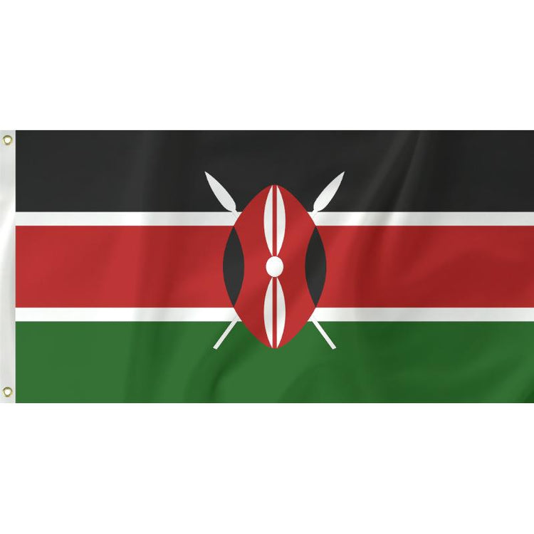 Shortly after Kenyan independence, the nation officially adopted their flag in 1963. A tricolour flag divided with black, red and green, the centre sports a Maasai shield and two spears. These are said to protect the ideals of all four colours - the people, the memory of the struggle for independence, the country's landscape, peace and honesty.