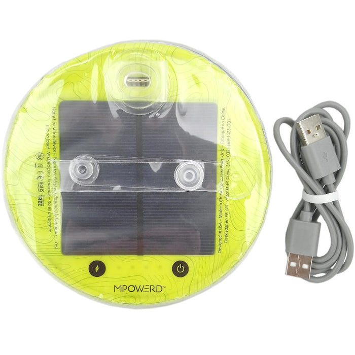 Power: Solar charged 5 LED lights. Includes USB plug for charging purposes