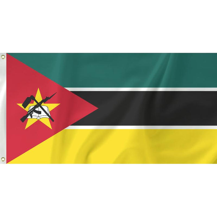 Mozambique adopted their flag in 1983. It is one of the few flags in the world that sports a firearm (an AK47 with bayonet attached). The AK47 is crossed with a farming mattock over the top of a open book. The rifle stands for the defense of Mozambique, the hoe stands for the country's agriculture. The open book displays the knowledge of power and the golden star represents Marxism.