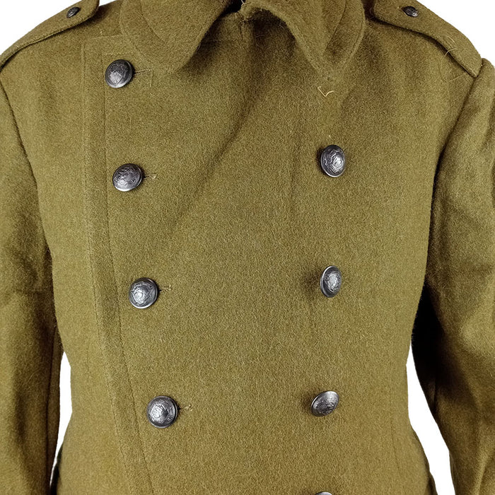 Straight from behind the Iron curtain, these Romanian great coats are pretty cozy! Made from a thick wool construction and a light cotton liner, these are both rugged and warm. To help aid this, the lining in the arms have elasticated cuffs to help trap any heat you generate. The chest buttons up and the split in the thighs/rear do as well should nature or movement calls.