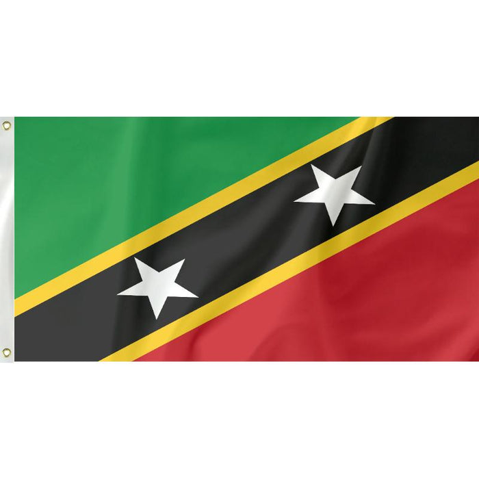 The flag of Saint Kitts and Nevis was adopted in 1983 on the same day they became an independent country. The green represents the country's fertile land, while the red stands for the fight for freedom against slavery and colonialism. The yellow stripes represent the sunshine the islands enjoy all year round, and the black represents the people's African origins. The two stars on the black band symbolize hope and liberty.