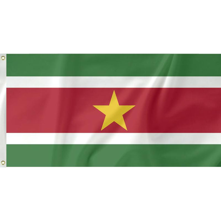 Suriname adopted their flag when they gained independence from the Netherlands in 1975. The star represents unity of all the ethnic groups in Suriname. The red stripe stands for progress and love, the green for fertility and hope, and the white stands for justice and peace.