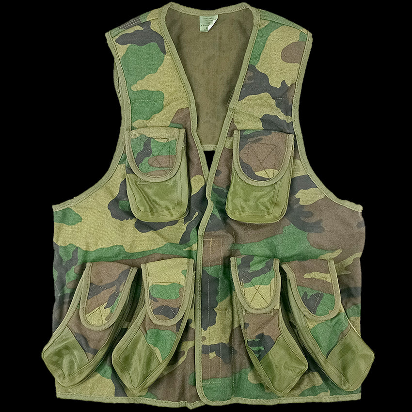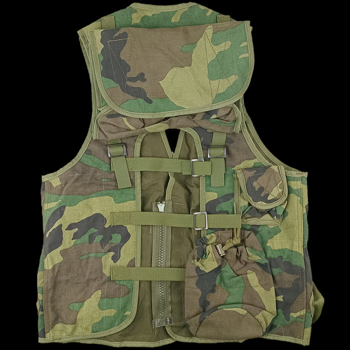 The front of the vest features multiple integrated pouches designed for AK/HK or similar rifle magazines, with additional utility compartments for gear, tools, or grenades. In a appealing M81 woodland clone camouflage, we might add.