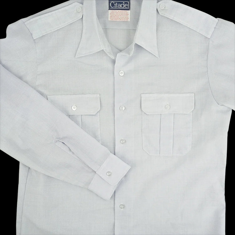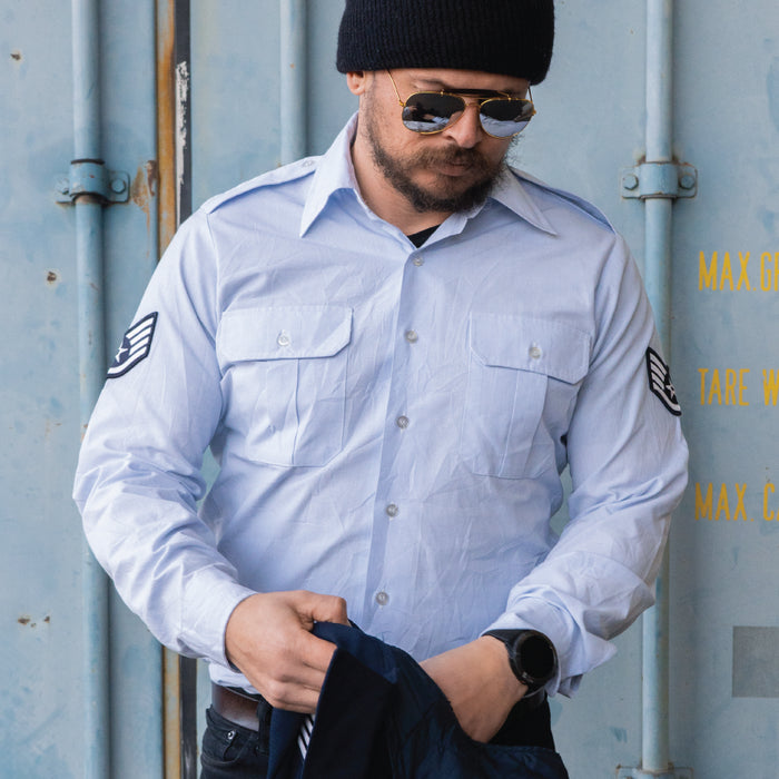 Some of these may have insignia (wings) added to the sleeves but if so, these can be unpicked for a plain shirt. The fabric is a lightweight poly/cotton blend for use in warmer temperatures. An undershirt may be required if you don't want your flesh showing through! The style of the shirt features a button up front and dress collar. Shoulder epaulettes enforce the military design. Pick one of these up to complete a US Air Force dress uniform or wear it as casual dress.
