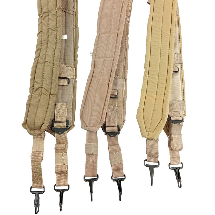 The shoulder pads are about 6.5cm across and have 4 snap closing clips to hook onto an ALICE belt. Some of these suspenders may have storage residue (especially from rubber bands), markings or wear from general use. These are great for sharing some of a belts weight to the upper body and add some extra pizzazz. All of these colour options are great additions for your desert ALICE loadout.