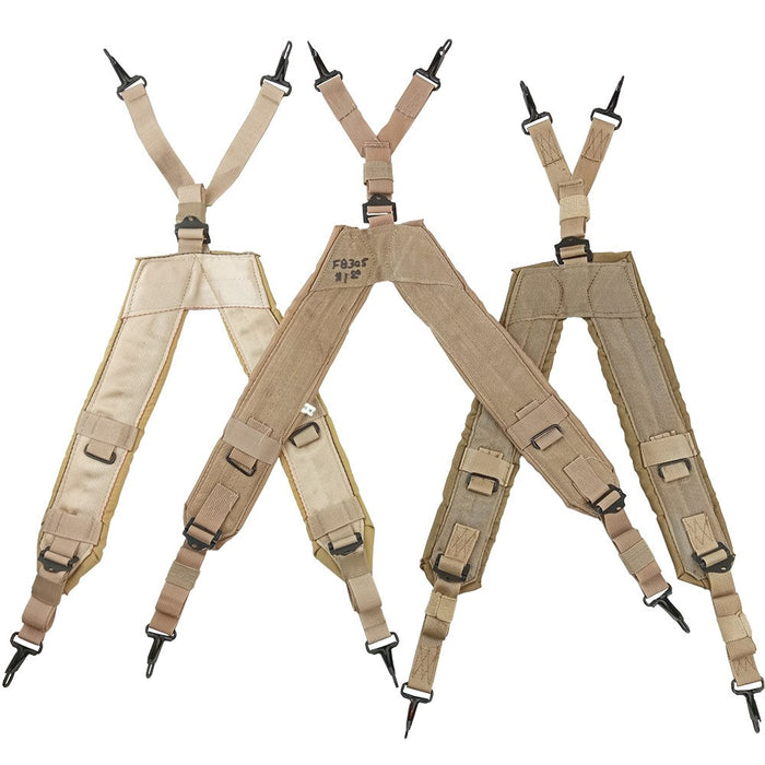 If you're an ALICE system user and looking for a load bearing helper - here we have a variety of beige themed LC2 suspenders (or yokes) to chose from! Interestingly the ''dark tan'' and coyote ones were made in Korea and the ''tan'' versions are US made + a little heftier in weight and materials. In the last image, the inner, skin-facing colours are more visible and are shown from R to L - ''coyote'', ''dark tan'' & ''tan''.