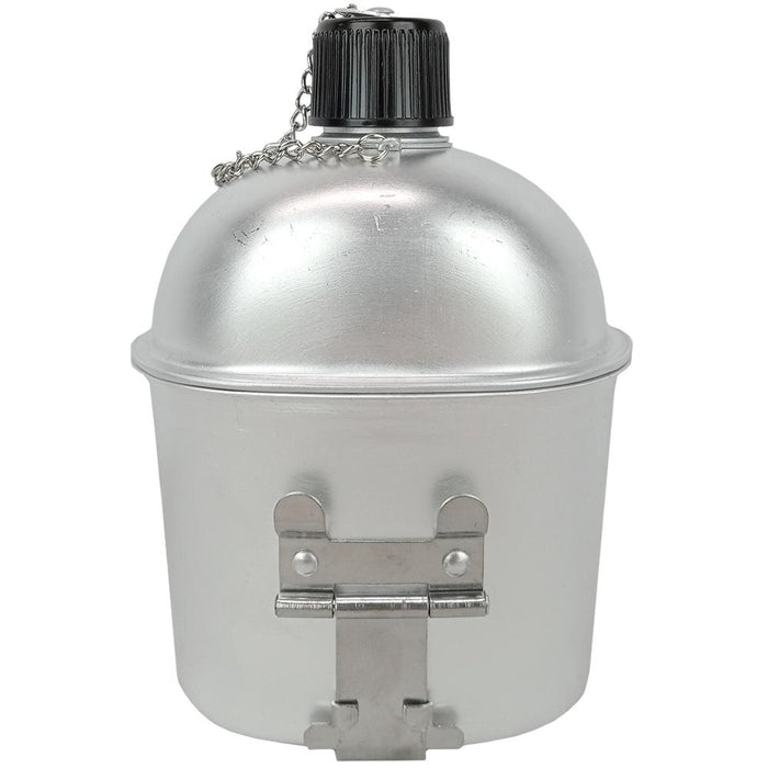 The 1 quart canteen got issued with a L-handle mess tin so you can stay both hydrated and fed. The L-handle packs down easy, locks into place and can stand alone much more securely than other contemporary mess tin designs. A simple chain makes sure you won't lose your canteen cap as well, a very simple yet clever combat design.