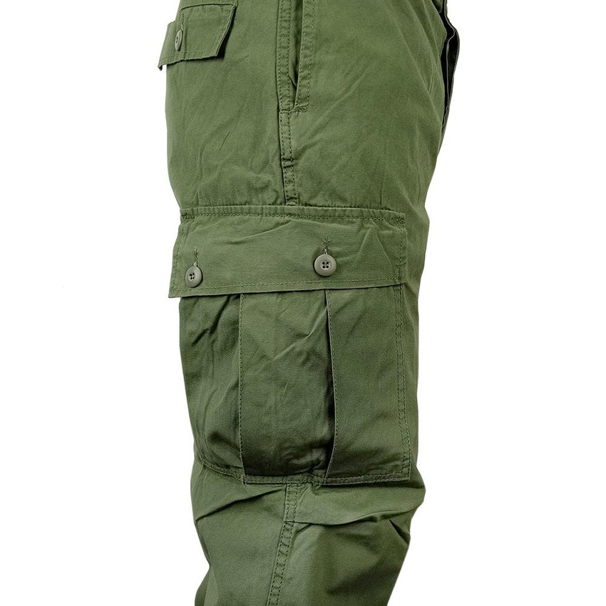 These reproductions have emulated the first pattern with no rip-stop and a 100% cotton build. Cargo pockets flanking either side allow for a good amount of storage as well as slash & rear pockets. A button up fly allows for silent 'extractions' in the jungle when Charles is near by. Ankles have adjustable ties as well to pull tight and insert in your jungle boots to stop the creepy crawlies from going up your trousers!