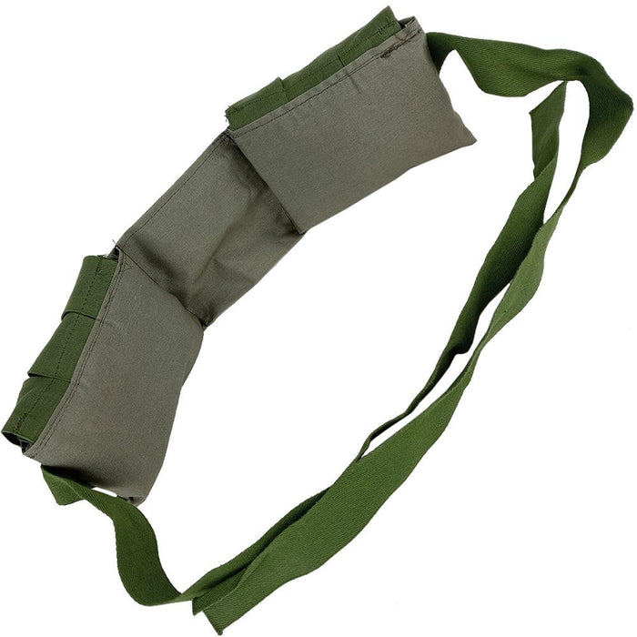 The rifle grenades are stored in two wings on the left and right. Each grenade shares space with 2 others in each wing but can be individually accessed with a snap dome flap each. Originally these would have plastic 'egg' inserts so the grenades wouldn't slip around and be easier to draw but are missing on these ones. A simple strap is used to physically tie a knot to secure the bandoleer around yourself, typically over shoulder but can be worn around the waist.