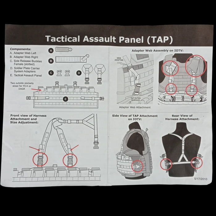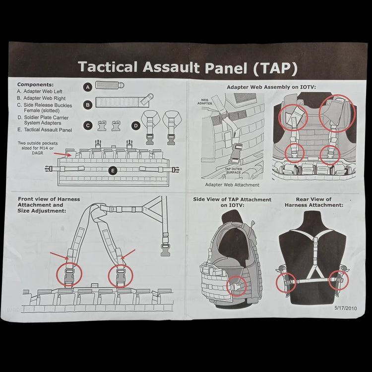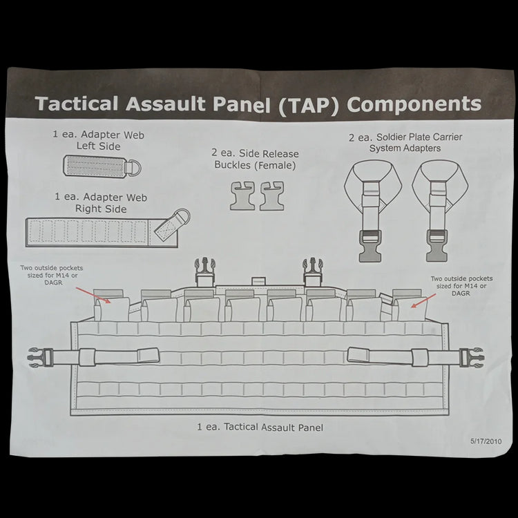 The main guts of these things is the 8 magazine array and a large MOLLE platform for you to add extra pouches as you see fit. Outer mag pouches each side have extra wiggle room and are designed for M14 or DAGR (Defense Advanced GPS Receiver), as per the handy instruction sheet pictured. A durable Cordura nylon fabric make load bearing a breeze and you don't have to worry about the wet weighing you down excessively. Stay cool in harness style or chuck it on your carrier for a satisfying low profile capacity boost without adding every mag pouch one by one.