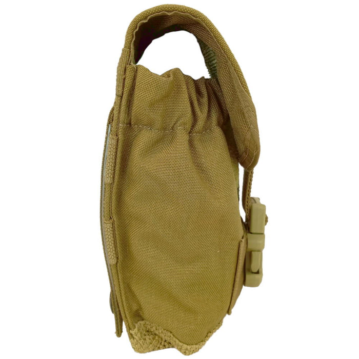 The design includes an adjustable top flap with quick-release buckle closure. Both the flap and inside of the pouch have a hook & loop strip so you can fold the flap inwards and rely on the elastic openings retention as a option. The bottom of the pouch has a large mesh area incase your canteen leaks. Alternatively this could be used to store clothing you need to air out while on the move such as socks, wet weather gear or the likes. A great, versatile pouch for your hiking and hunting needs.