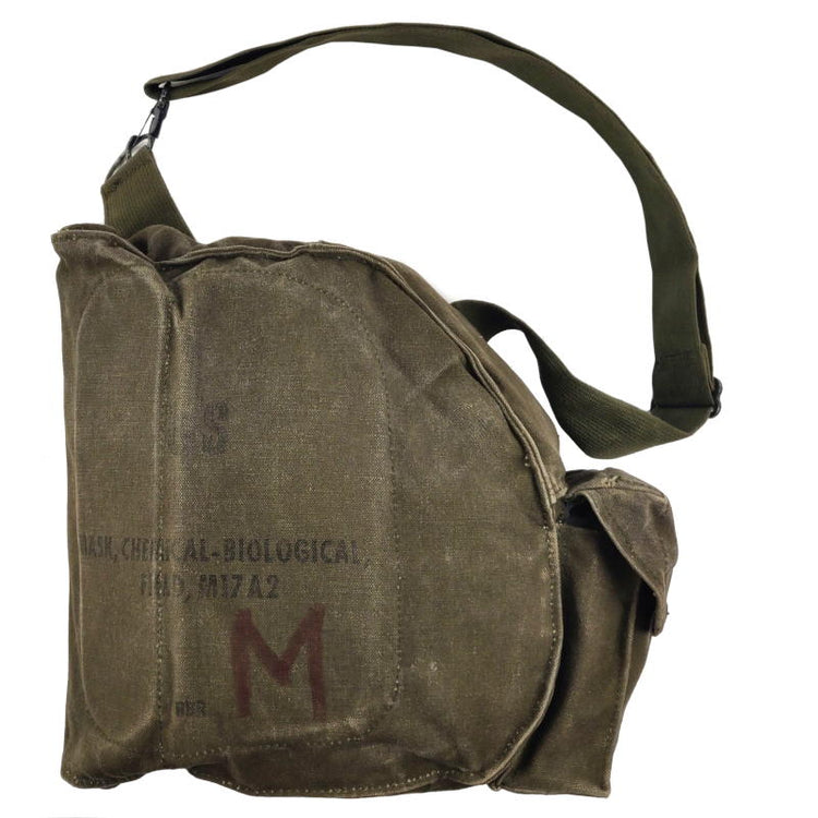 M17 protective masks were produced in 1959 as a replacement for the M-9 gas mask. The US Army issued three types of M17 masks, the M17, M17A1 and M17A2. This M-17 carry bag would house the gas mask components; filter, face piece and outserts. Complete with two straps for wearing over the shoulder or around the waist.