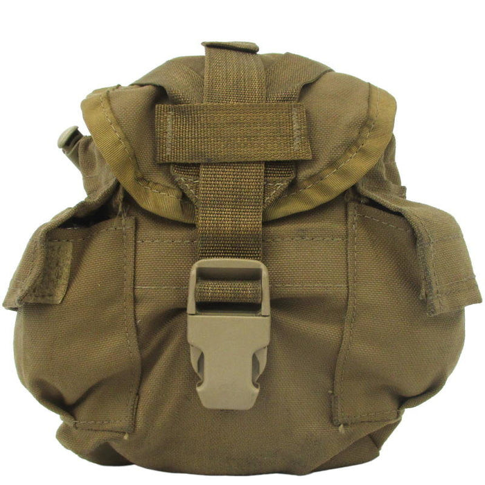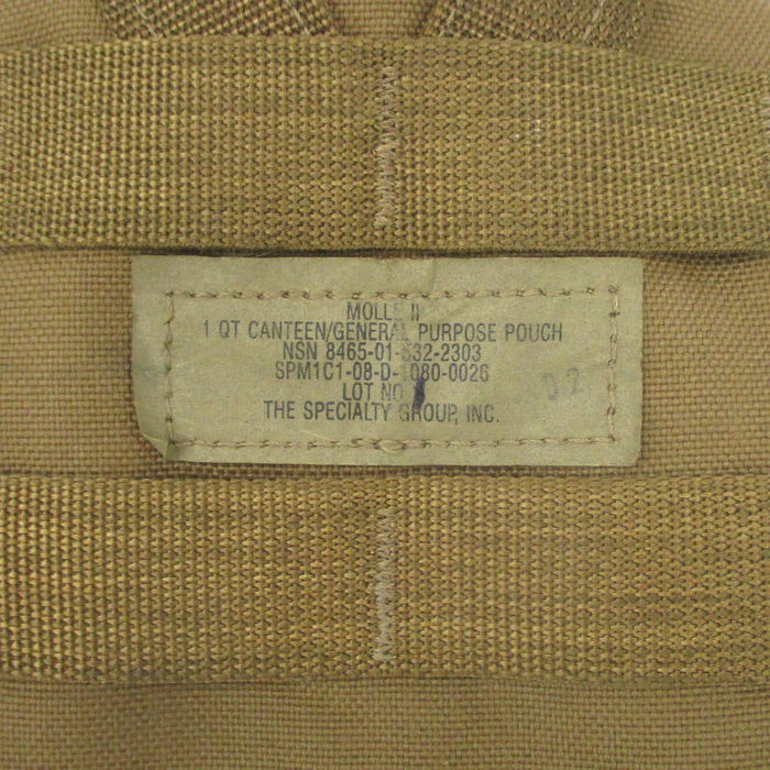 The MOLLE II coyote canteen pouch will accommodate a 1 quart (0.95 litres) US canteen, water purification tablets and matches or other fire starters. Labeled "POUCH, CANTEEN CARRIER/UTILITY", indicating that it can be used for general purpose items as well. Dual MOLLE straps allow the pouch to be attached to belts, combat vests and packs.
