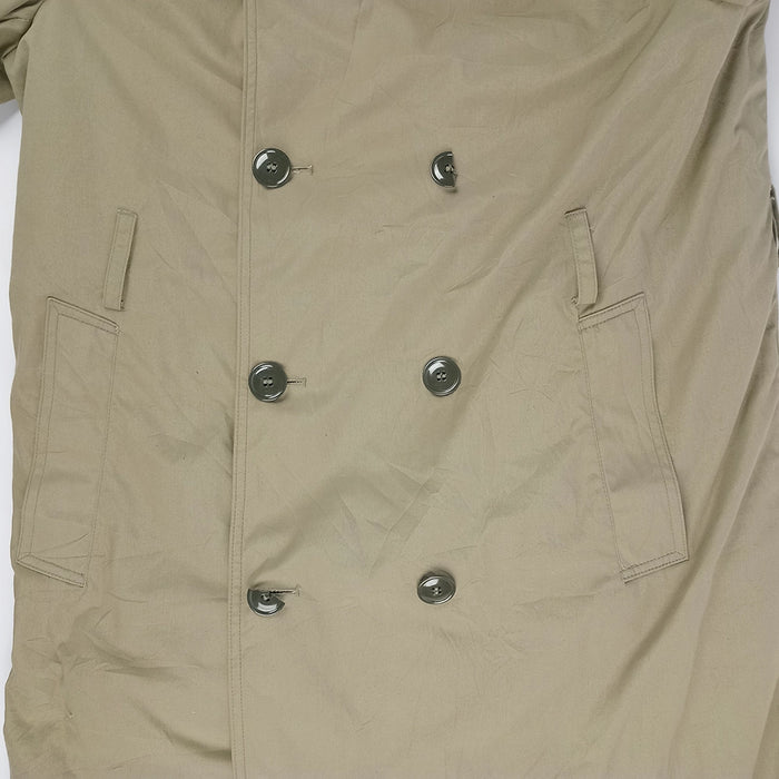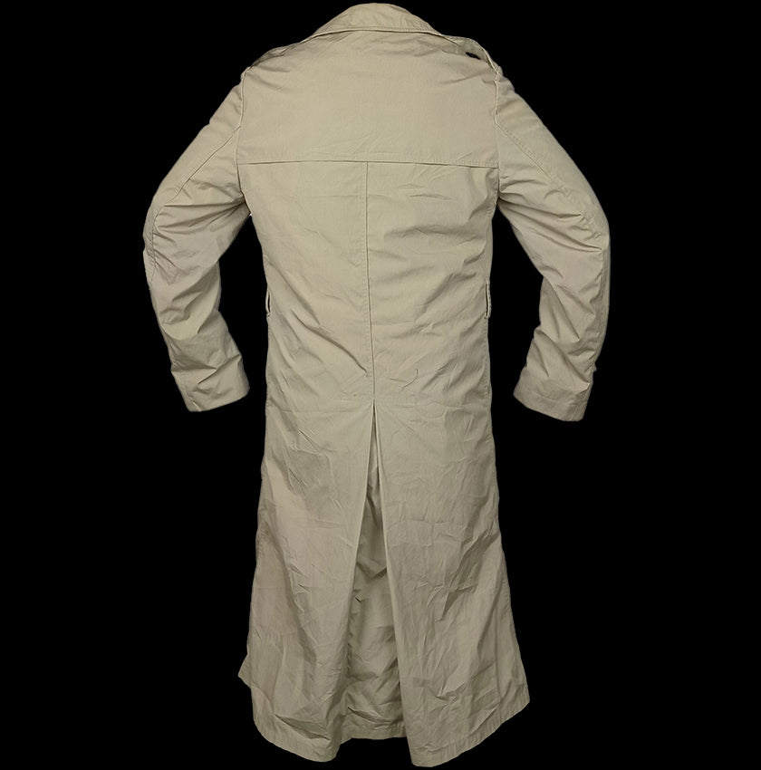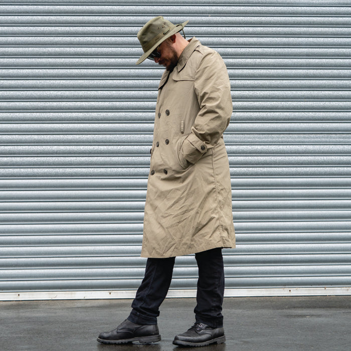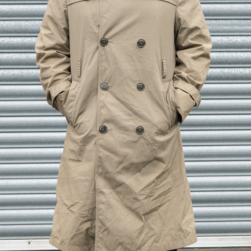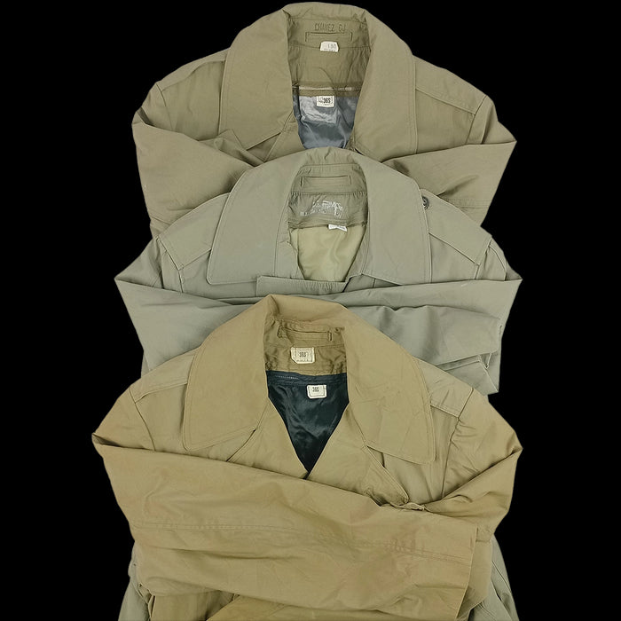 These classic cut trench coats in polyester/cotton are hard to beat and have a place in almost every wardrobe. These Man's All Weather Coat from the US Marine Corps, in ''pewter'', are a medley of khaki/tan/grey-beige colourways.