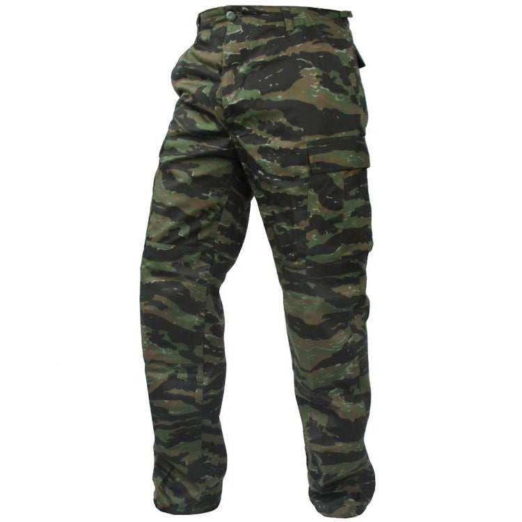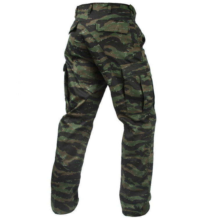 The tiger stripe camouflage pattern was originally produced for the Vietnamese Marine Corps in the 1960's. This modern recreation of the striking pattern is a spectacular sight on these trousers. Stand out while blending in on the paintball or airsoft field with this unique pattern. With durable knee reinforcement be prepared to get down and dirty over rough terrain while preventing tears. Adjustable waist tabs and drawstring cuffs ensure a secure fit, allowing you to pull swift maneuvers.