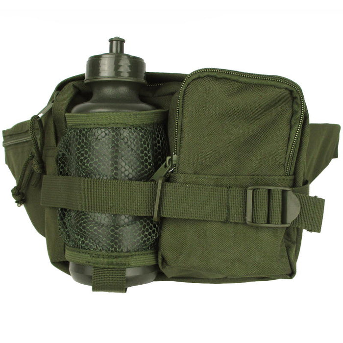 This handy little waist pack is perfect for carrying a snack and drink on short walks or for holding your essential items while traveling. Included with this bag is a water bottle which slides into a secure pouch for quick and easy access. The main compartment is large enough for a sandwich or two, leaving the front pocket free for your smaller items such as keys or a phone. On the back, the bag features a buckle up waist strap with a small pocket and a carrying handle. A convenient pack for a casual walk on the hills.
