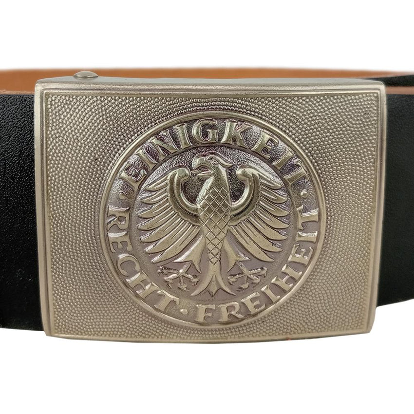 Standard issue West German army leather belt with die stamped, solid construction, box buckle. This is a thick leather belt with an ornate box style buckle featuring an embossed national eagle with down-swept wings. Encompassing the eagle is the script 'EINIGKEIT RECHT FREIHEIT' which translated means 'Unity Justice Freedom'.