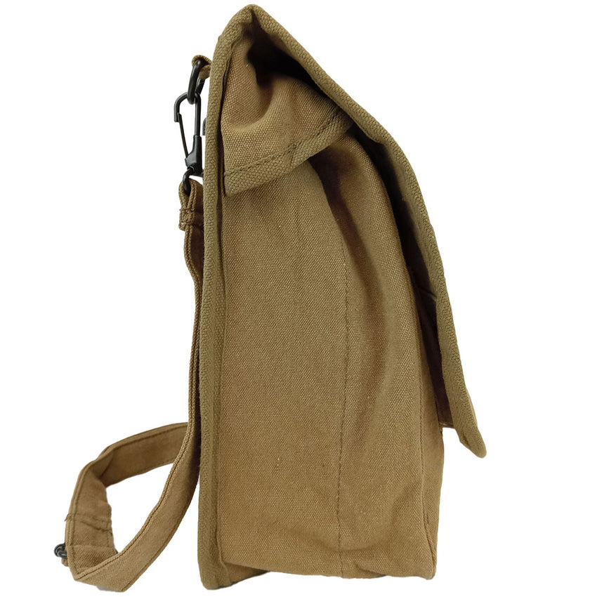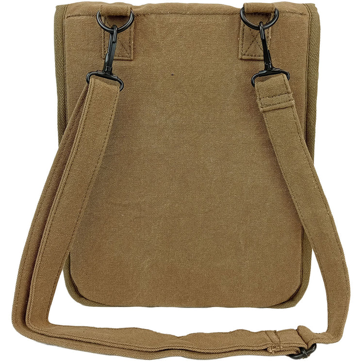 These shoulder bags have a nice hard backing designed to rest a map against so you can mark on it easily. Even if you don't intend to wield a map, these little guys work really well as a every day carry bag. Particularly if you are a book worm & want to protect those lovely softbacks of yours! The main compartment is accessed with a snap dome flap and is divided into 2 compartments. On the outside underneath the flap is a elasticated pen holder for easy access. Made with cotton canvas they have a pretty nifty vintage look and robust to boot.