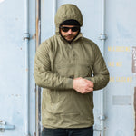 Another part of the British Army's Personal Clothing System that morphs excellently into civilian life. This fellow is a fleece lined, anorak style mid layer. These are close fitting but could be worn with a thin base layer (such as a thermal top) underneath. These are so close fitting - especially around the chest/armpits - we recommend to size up for comfort (or aesthetic). These ''smocks'' have wind sealed zips all over (quite a few!) and aid in temperature regulation and function. The two slanted pockets are access points for one kangaroo style pocket (great for warming hands) and the mid-chest pocket adds more storage. Zips to the underarms and torso sides let in some fresh air if you are a bit too toasty. The whole interior is lined with fleece and the exterior is a thin ripstop nylon. A small emergency hood is stowable in the neck. Hook & loop adjustable waist and cuffs + a draw cord to the neck seal you up for extra toastiness. Like other pieces in the PCS family, these are ''light olive'' in colour and fall somewhere between khaki, coyote and olive, as well as having some slight colour variations in the jacket and zips. As surplus items, some may have marks or the odd ID written to the interior (see last image for an example). Nevertheless, these are a nice travel friendly, lightweight piece of surplus.