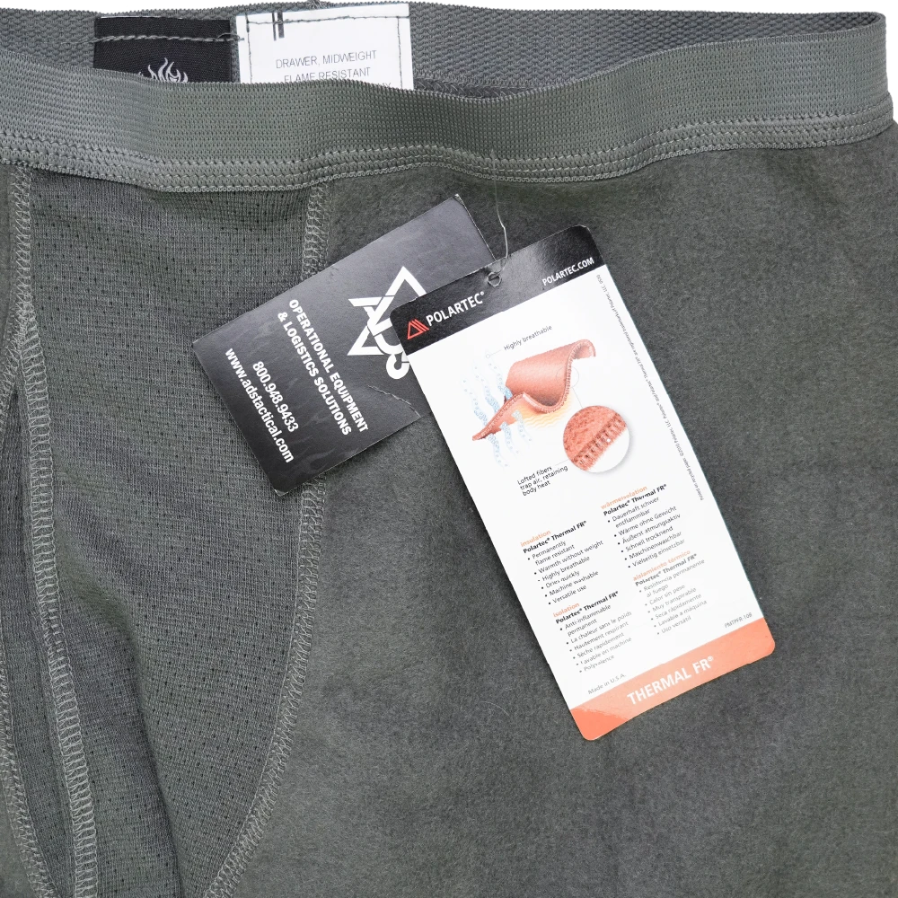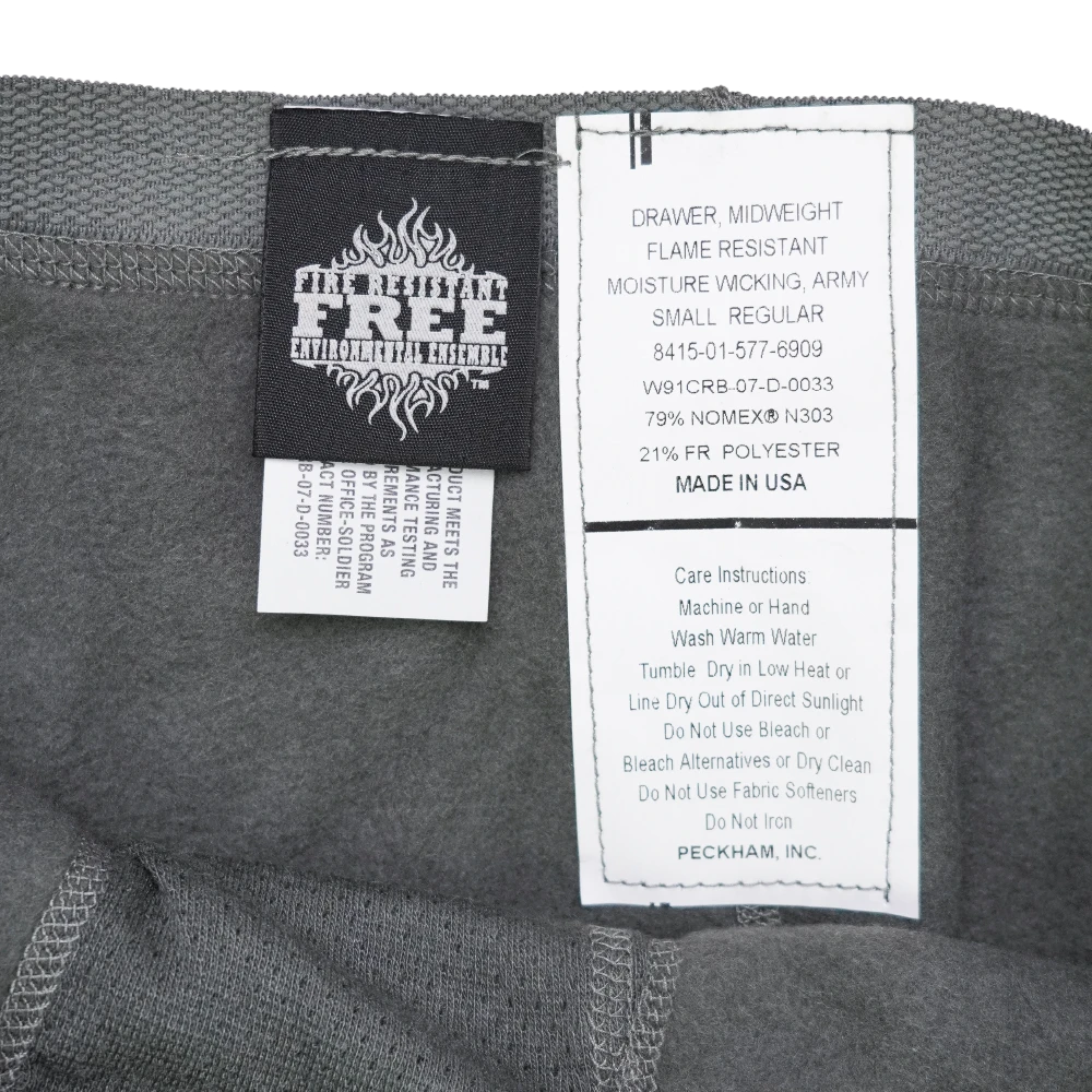 US Army midweight moisture wicking drawers in Small Regular. Military surplus base layer trousers designed as part of a cold weather clothing system.