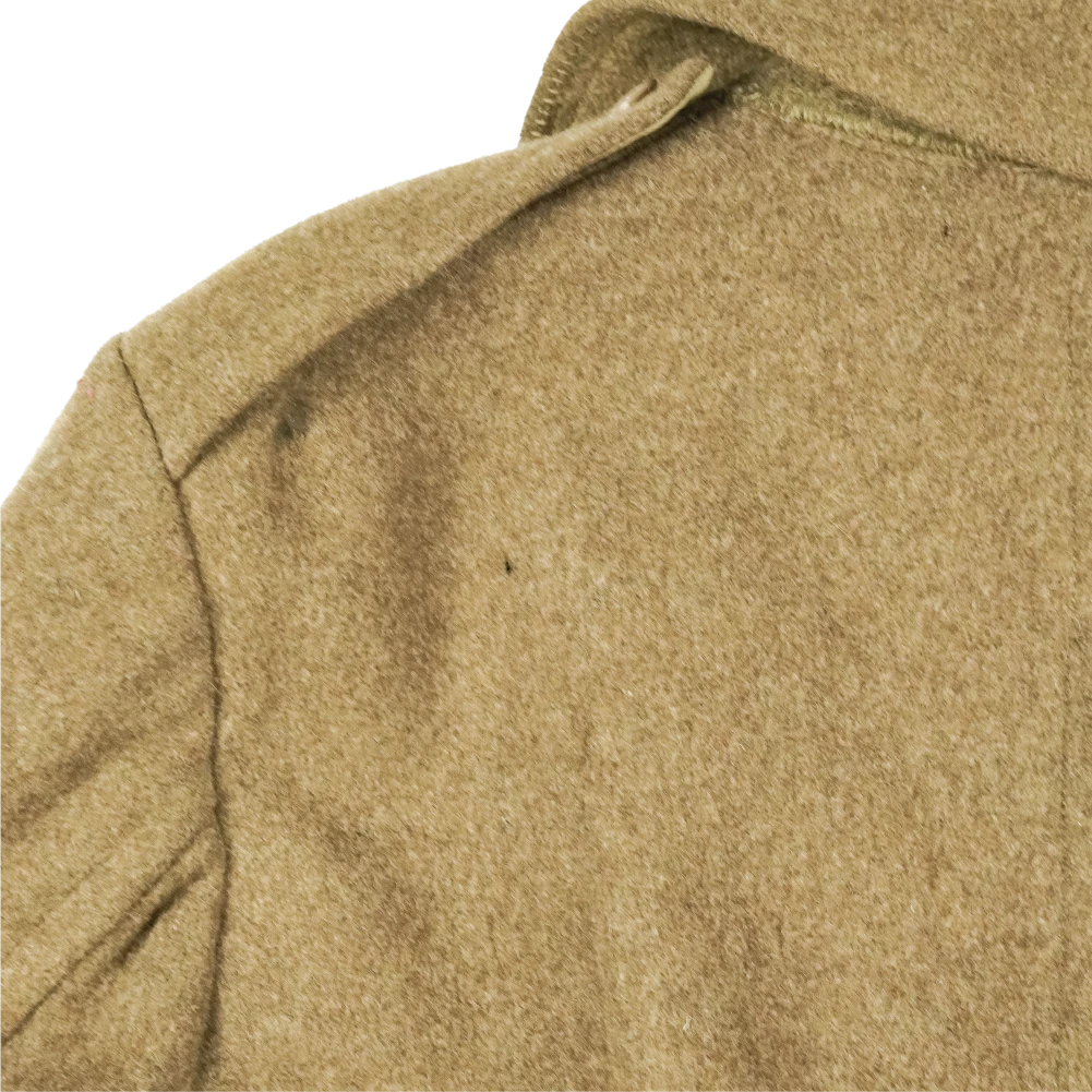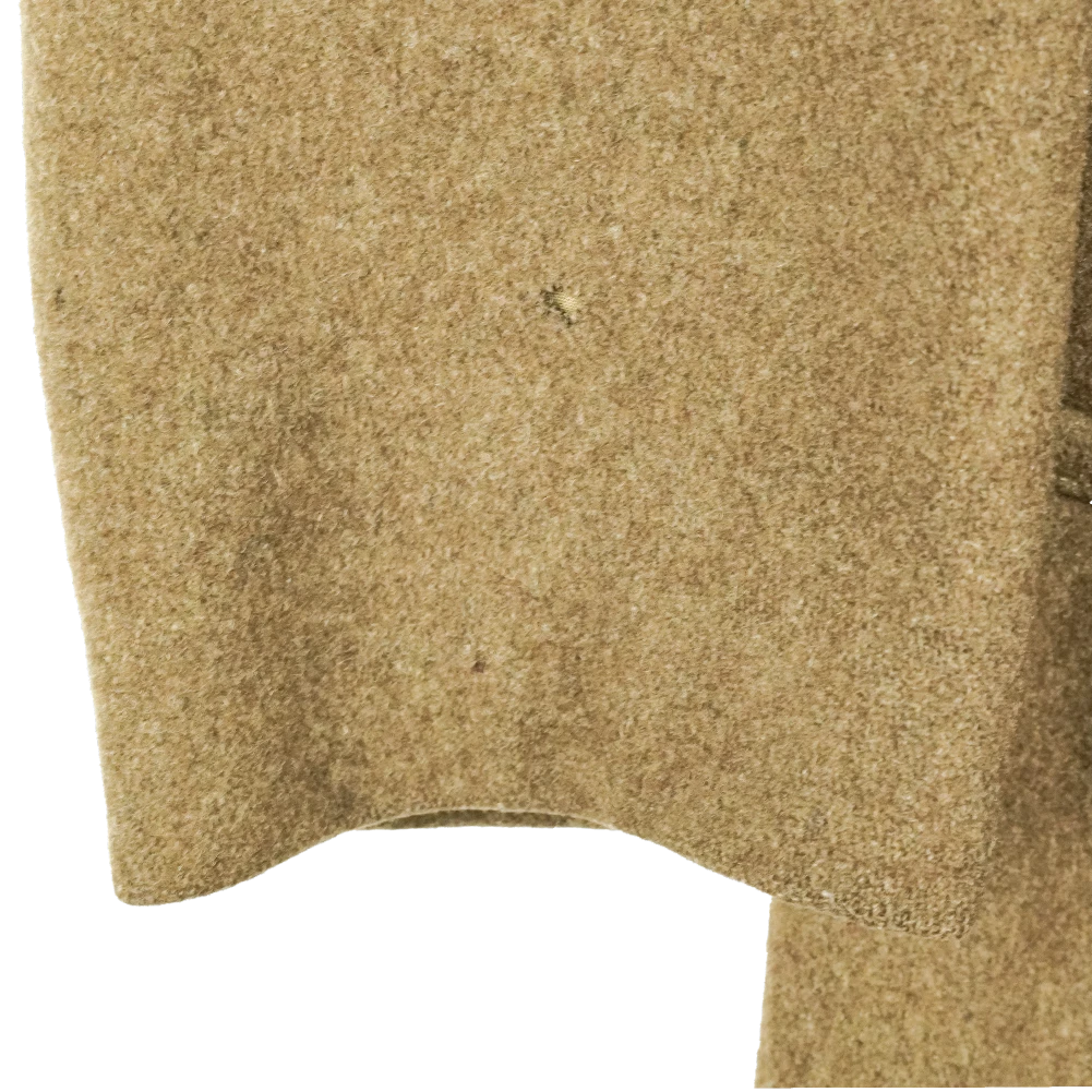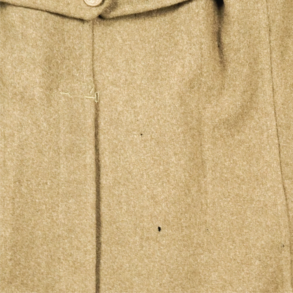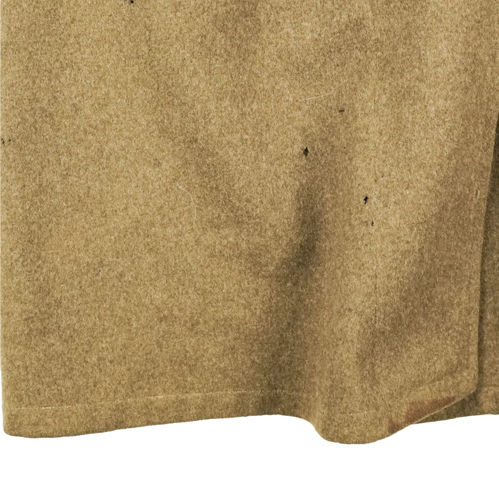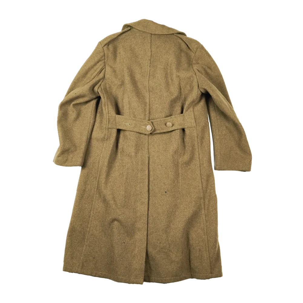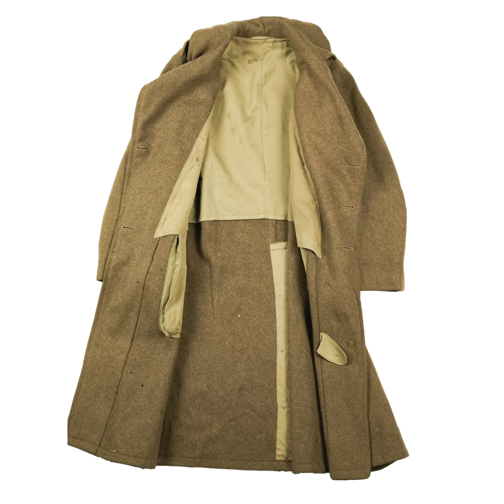 US M1942 pattern wool overcoat in military surplus condition. A long wool overcoat with a traditional button-front design.