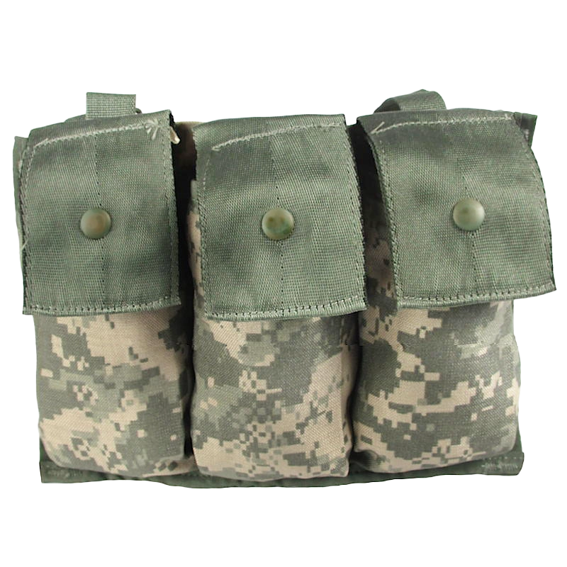 The US Army provides this bandoleer for rifleman to carry additional ammunition across their chest. These pouches will hold up to six (two in each pouch) M16 magazines. Some of our latest batch have foliage green (grey-green) top flaps and some are grey.