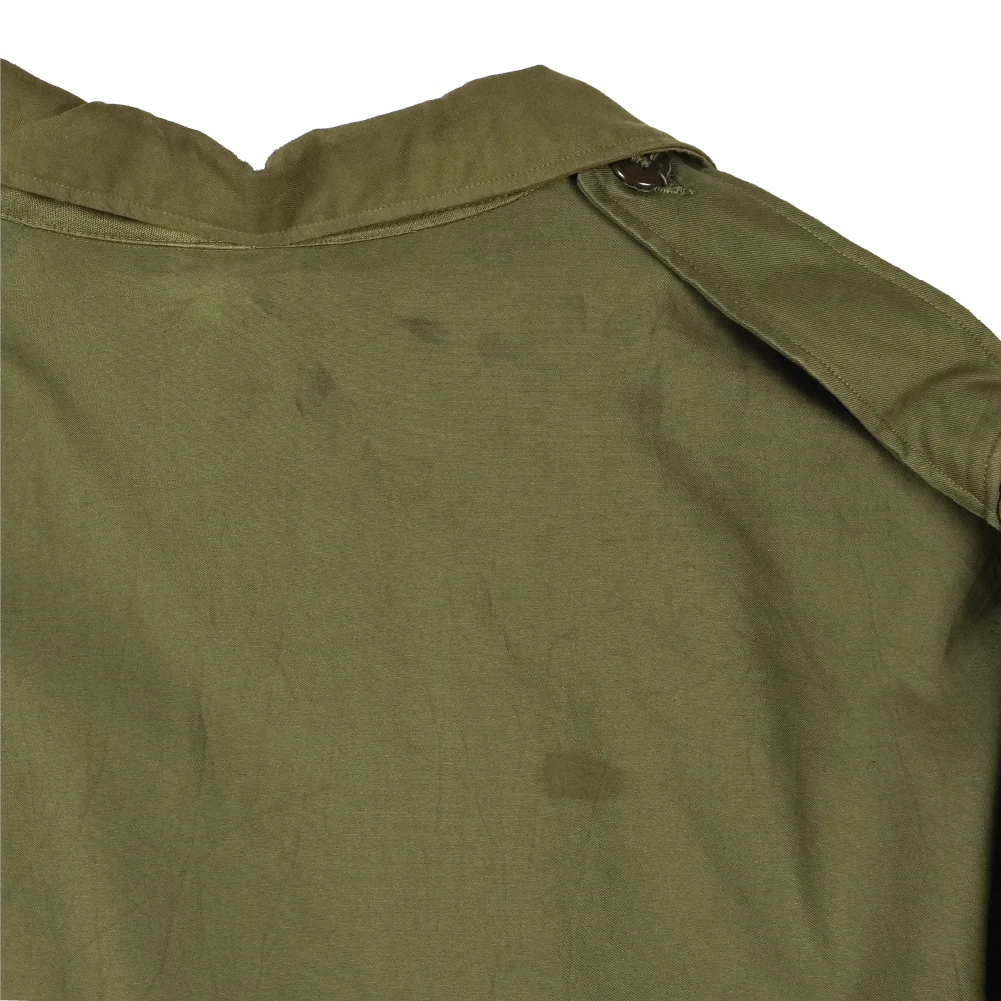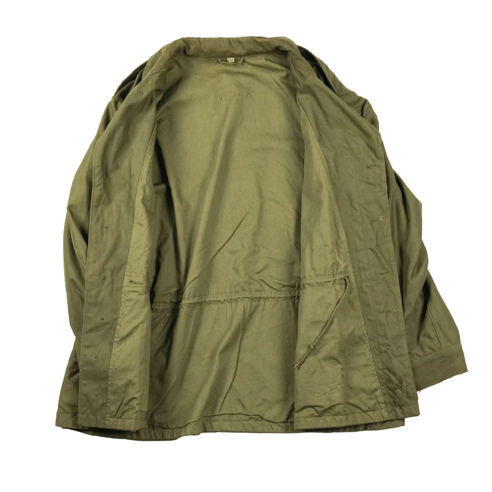 USGI M-1943 field jacket in surplus condition. This is the outer shell jacket only. It features a button-front closure and multiple front pockets typical of the M-1943 pattern.