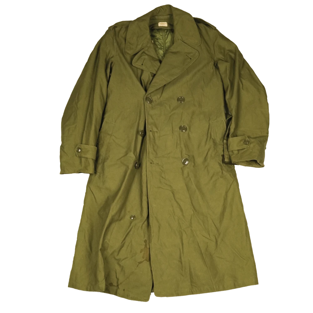 USGI M-1950 overcoat in a double-breasted design. It features waist pockets with flaps that open further into the coat, button-adjustable cuffs, and a buttoned liner attachment point.