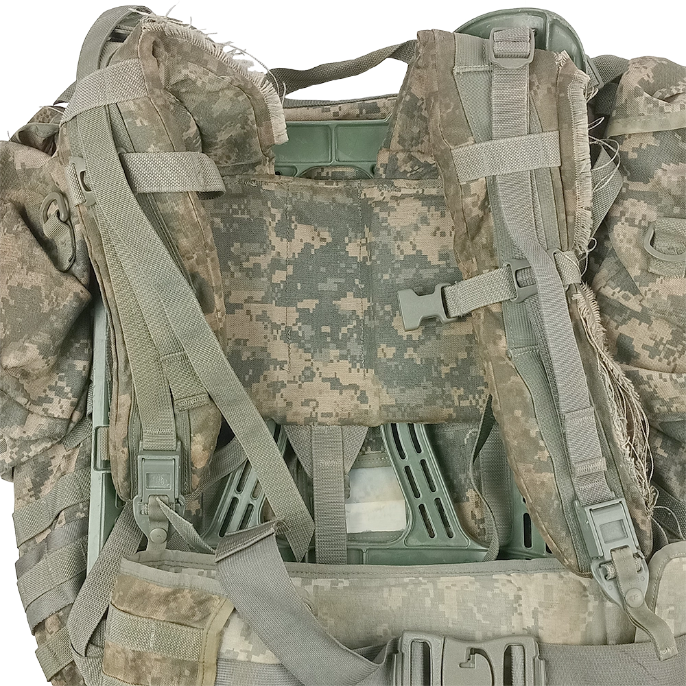 Ye olde Equipment MOLLE II Rucksack, Large. These big fellas have had a rumble helping the boys on Turtle Island lug their gear around. So much of a rumble, some have lost straps, gained some extra holes or lost some components. These should contain the frame, rucksack, shoulder straps and waist belt, all in varying conditions.